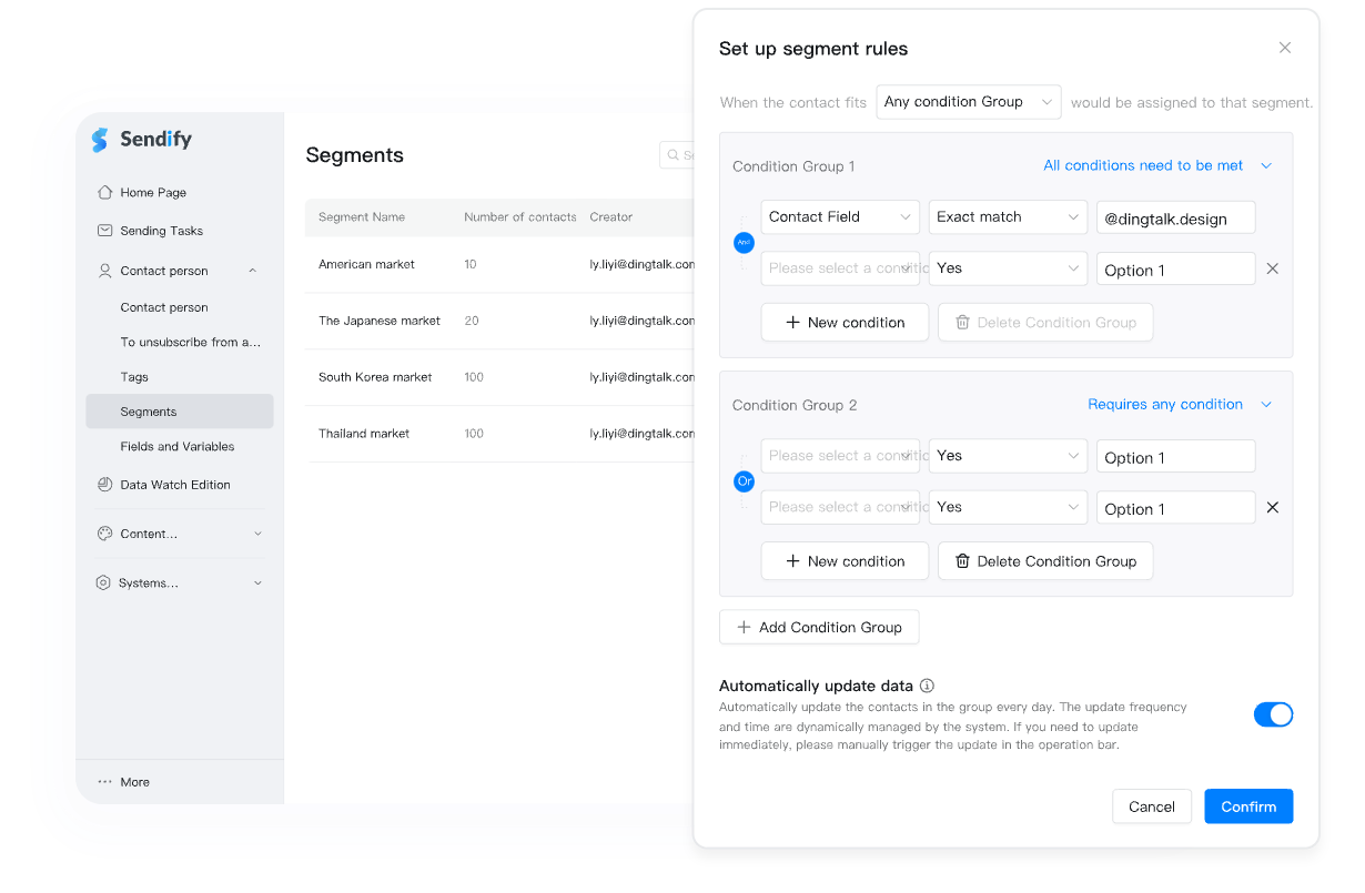 生成动态群体:通过配置联系人属性、标签和行为规则,自动生成动态的联系人群体,确保您的营销活动始终针对最相关的受众。